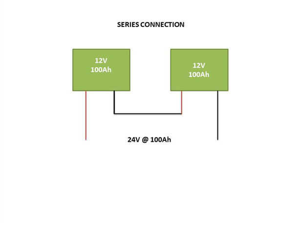 Así que si estos dispositivos eran pilas y cada batería tenía una calificación de 100 Ah y 12 voltios el valor total de este circuito serie sería 48 voltios 100Ah. Si fueran paneles solares y cada panel solar tenían una calificación de 17 voltios (voltaje del oscilador) y clasificaron en 5 amperios, entonces el valor total del circuito sería 68 voltios, 5 amperios.