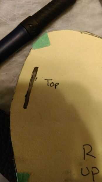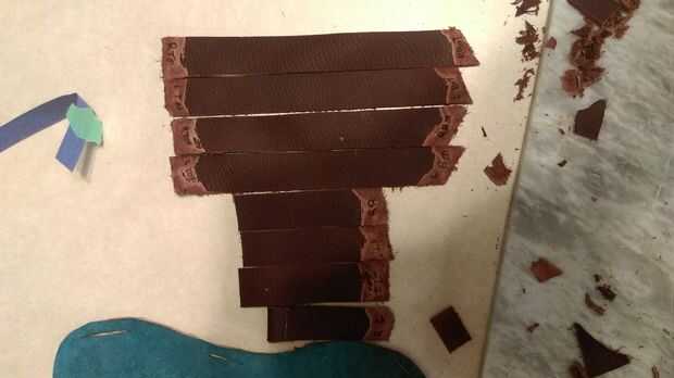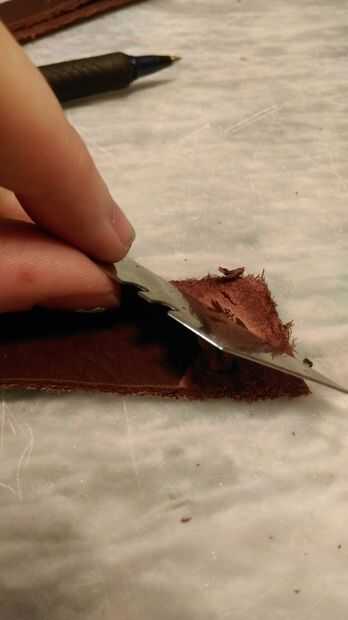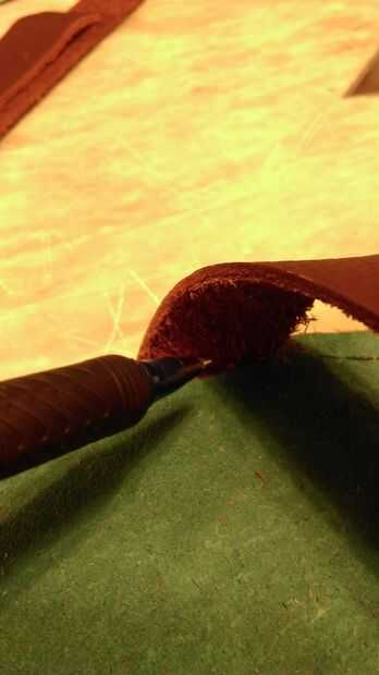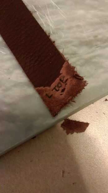 Después de haber cortado los agujeros de ajuste cada correa a su pie otra vez. Marque cada tira en el interior donde cabe y retire. Más allá de esta marca quiere "skive" el extremo de la correa, básicamente para ser gradualmente mucho más delgado con una cuchilla exacto afeitarse. Hacer esto con cada correa. Porque hay tantas correas similares marcan este borde raspada con algún tipo de sistema que coordina con su patrón para que usted sepa donde va cada extremo de cada tira.