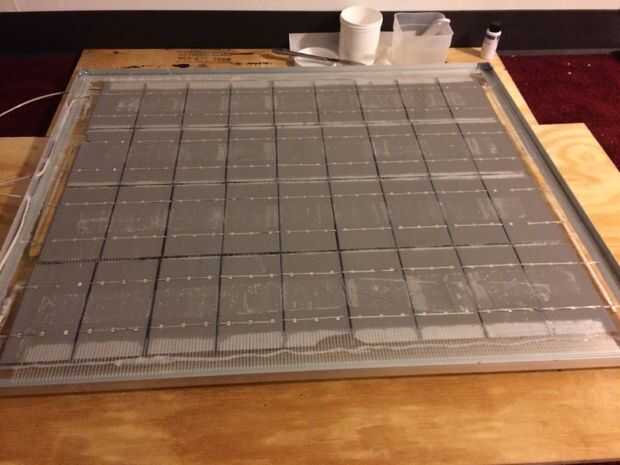 La frontera de silicón ayudará a mantener la resina en lugar tanto como usted puede en la parte posterior de las células. Finalmente la resina se filtrará en todos los rincones y grietas. Esto es donde ese pincel de repostería en la foto viene muy bien para difundir todo. Quieres una buena capa uniforme. Es bueno tener su panel de sentarse en un lugar fresco mientras que establece. Esto le llevará un tiempo y eso es bueno! Desea que un largo ajuste de hora para que las burbujas de aire se levantarán a la tapa y el pop. Las burbujas no son algo malo pero es mejor evitarlos. Si la resina está tomando mucho tiempo para establecer y aún se siente "pegajosa" se podría establecer por una ventana que recibe mucha luz del sol.