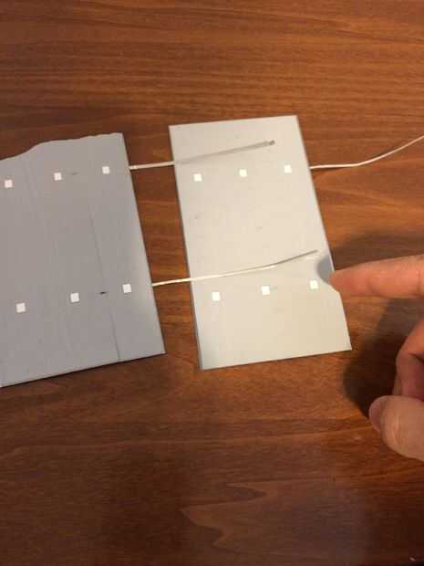 En la sección de materiales, la foto que muestra el cable de tabulación en tiras de poco necesario manualmente cortar yo mismo. Tabulación de alambre generalmente viene en un carrete, y por qué corté un pedazo de cartón 3 pulgadas en dimensión. Sé lo que estás pensando, "¿por qué no simplemente cortar un pedazo de 6 pulgadas de cartón ya que las rayas deben ser de 6 pulgadas de largo?" También quería asegurarse de que el cable tenía un poco más de 6 pulgadas de bucle alrededor de la cartulina porque es necesario que haya un pequeño espacio entre las células.