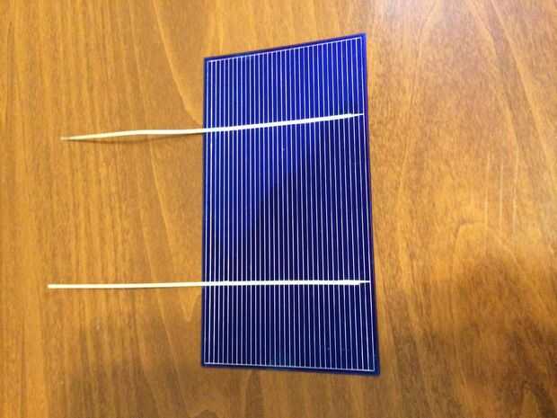 Una vez tienes 72 pedazos de alambre de tabulación, es necesario aplicar un poco de flujo de su pluma de flujo a las dos tiras de gris en la parte delantera de la célula solar y utilice el soldador soldarlo hacia abajo como en la primera foto. Tabulación de alambre tiene soldadura para que no te preocupes sobre la aplicación de más. Usted sabrá cuando la plancha está bastante caliente porque el alambre tabulación cambiará físicamente un poco para fundir a la célula solar.