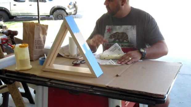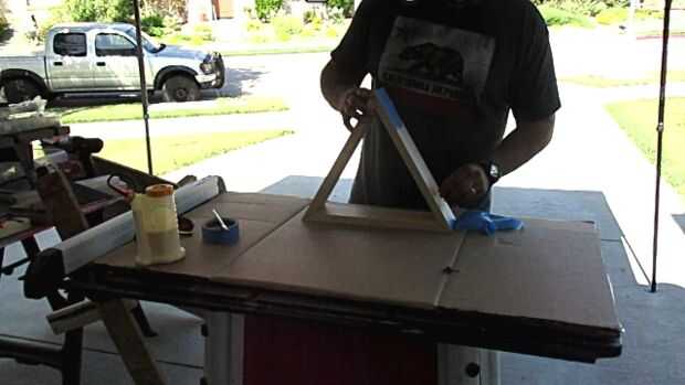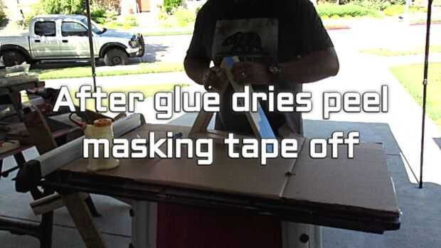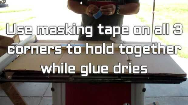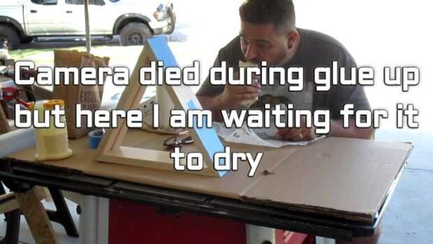 Lamentablemente mi cámara murió durante este proceso pero todo lo hice fue voltear las piezas y aplica pegamento de madera en las uniones y ensambladas las piezas para formar un triángulo. Utilicé la cinta de pintor en lugar de pinzas ya que no tengo nada que se acomode a la forma del triángulo. Esto salió bien y fue realmente más fácil que usando abrazaderas. Las juntas no eran perfectas y no muy fuerte pero está bien porque fortalecerá las articulaciones en el siguiente paso.