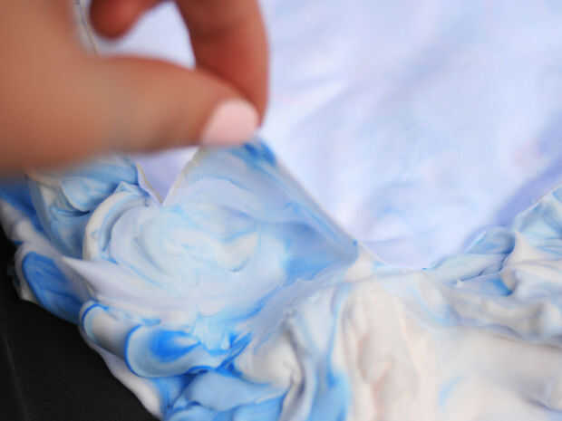 Paso cuatro: ahora que tienes tu lista infiltrada, tomar el primer triángulo y poner encima la crema. Coloque uniformemente y golpee ligeramente. Después de unos segundos lo saque la crema y sobre una superficie protegida. Repetir este proceso para el segundo triángulo. Agregar más crema y si no puede ver mucho color del tinte.
