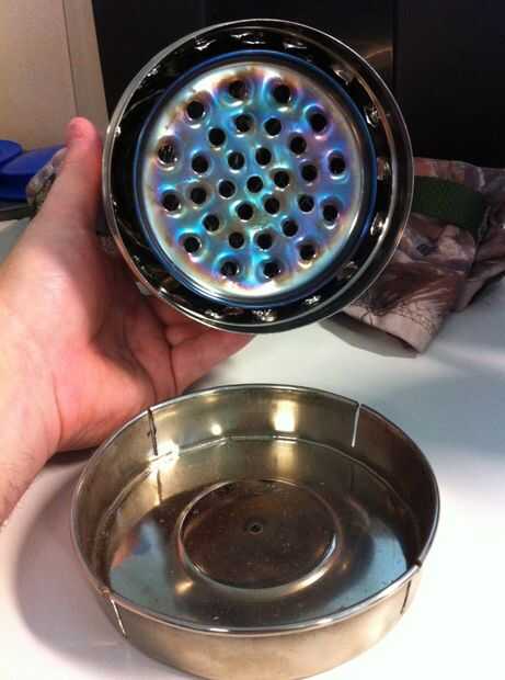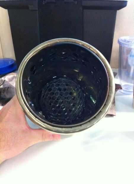 Usé la tapa del frasco como la parte inferior. (ver imagen 3) Lo dejé en durante la quema toda. No interfirió con el fuego/trozos de carbón. De hecho, cogió el pequeño caer brasas y ceniza. Sobre la cantidad de ceniza izquierda era igual al tamaño y el grosor de un níquel. prácticamente nada. Muy eficiente.