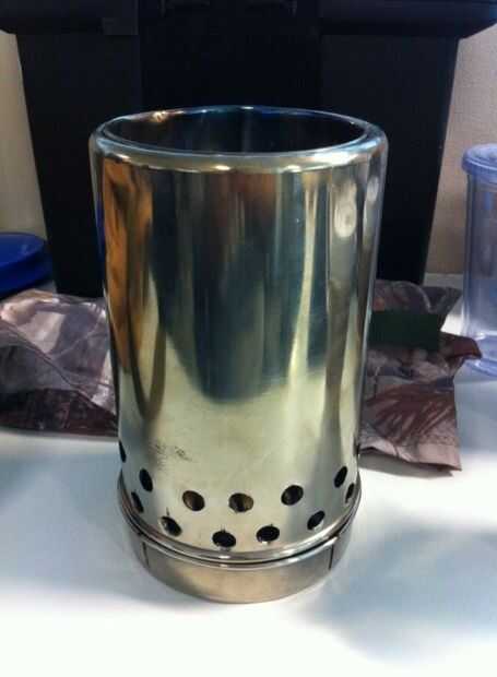 Funcionó muy bien. Calienta bien, permaneció encendido un rato, pero me di cuenta de algunas cosas. #1, fue débil. #2, se oxida fácilmente. (la lata se oxida rápidamente una vez que es quemar la capa protectora). Me decidí a construir uno mejor. Que lavada de kijiji y encontré a una señora que tenía 4 latas de acero inoxidable, y encontré un soporte de utensilio de cocina de acero inoxidable en el mundo de Wally. Utilicé un trozo de metal extensible (utilizado para hacer estuco) de la rampa interior. (ver imagen 2) He probado ayer por la noche con un trozo largo de 4 pulgadas de pino machihembrado. Era 4" largo x 4" de ancho x 3/8" de espesor. Encendió con un firestarter (bola de algodón empapada en vaselina). Esta muy pequeño trozo de madera quemada durante 13 minutos y los carbones fueron rojo caliente durante otros 8 minutos! Es de 21 minutos de grabación de un muy pequeño pedazo de madera suave de pino. ES un poco más pesado que la versión lata pero durará mucho más tiempo.