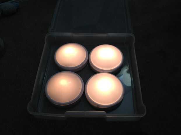 Abra la caja de plástico transparente y coloque las 4 luces en el cuadro. Toque cada luz para encender.