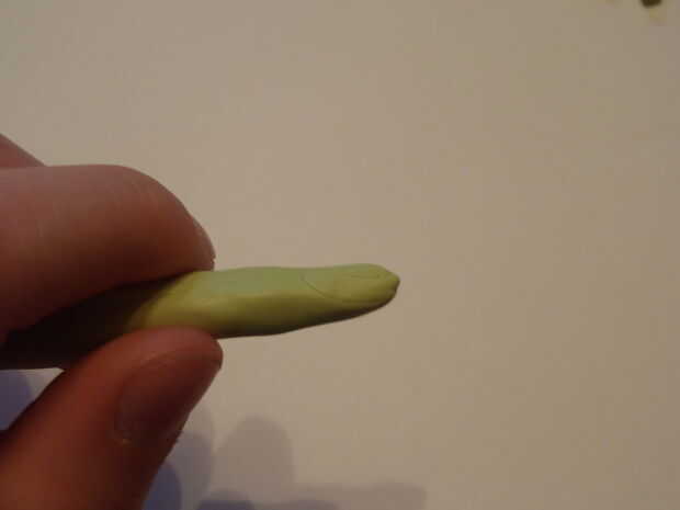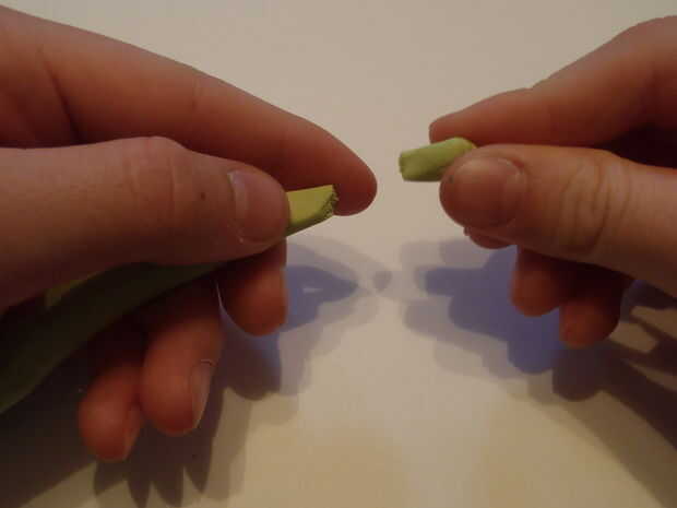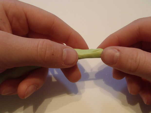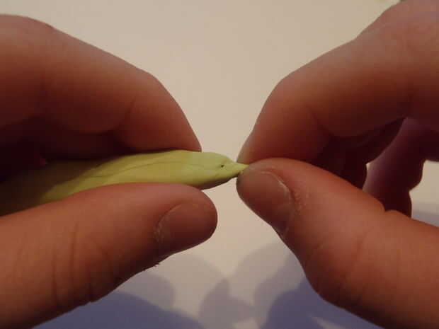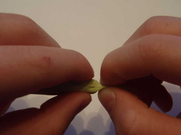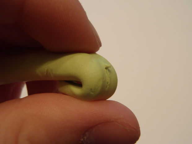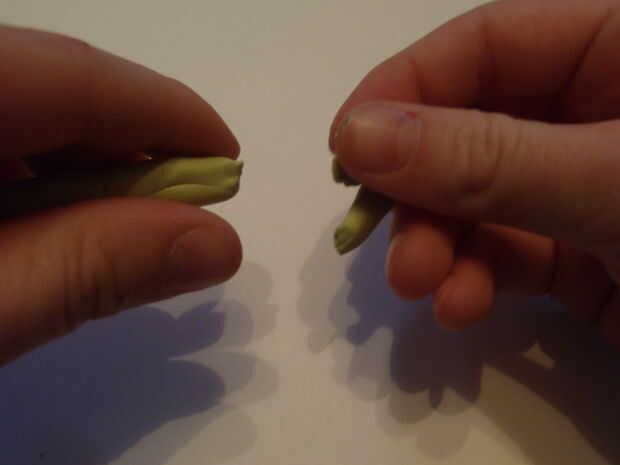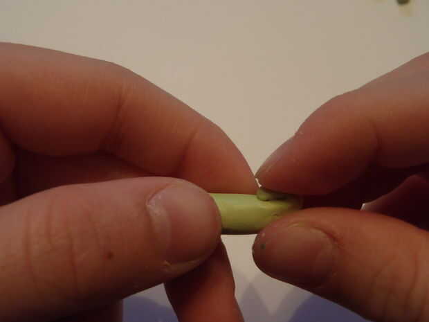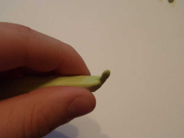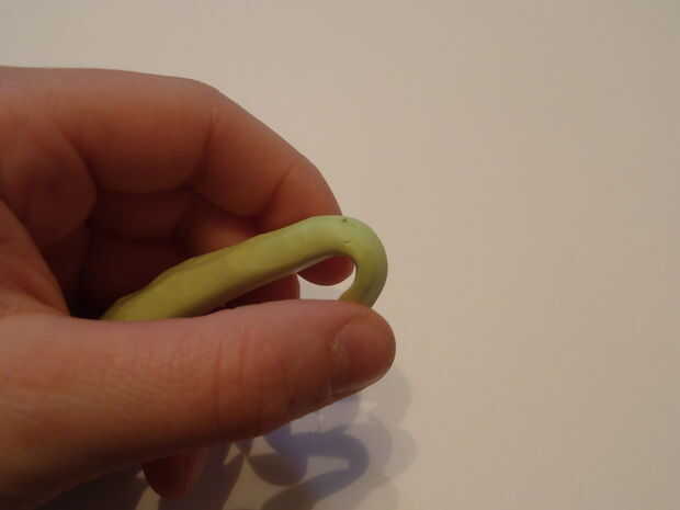 Con la serpiente como pieza de sculpey, saque una pequeña sección de la parte superior, asegurándose de no revelar el cable. Después de eso, doble sobre una pequeña porción de la arcilla, revela el cable. Ello, para que sepas dónde dejar al sacar al final de la arcilla. Ahora que sabe donde comienza el cable, enderezar la arcilla hacia fuera y quitar el sculpey, asegurándose de que el cable está casi empujando hacia fuera. Apriete alrededor de la punta del alambre por lo que se trata de un punto. Doblar la aleta sculpey sobre el alambre, por lo que una vez más se esconde. Ahora, suavizar el sculpey para que no se vean costuras. Lo mismo al otro lado.