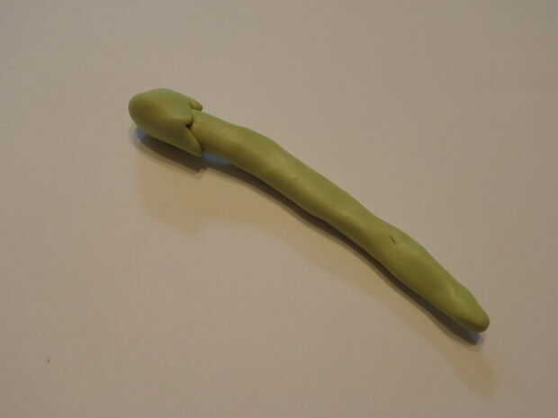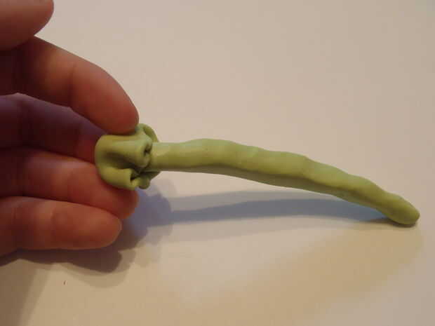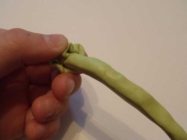 • Con el círculo plano que creamos anteriormente, colocar en cualquier extremo de la pieza de serpiente-como sculpey. Pliegan por lo que parece un taco con una serpiente sobresale. Seguir doblando una y otra vez, la forma de taco para que quede bien apretada contra la serpiente. Usted ahora ha completado la base.