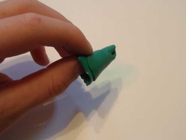 Este paso en la fabricación de la seta es particularmente difícil. En primer lugar, plegar un lado triangular del rectángulo aplanado, dejando un pequeño agujero en el centro. Con cuidado enrollar la parte superior de la seta, por lo que parece un triángulo 3D. Cerrar la costura de pequeño con los dedos para que no se ve. Ahora, inserte un lápiz, el lado del borrador, el triángulo y utilice sus dedos para cerrar la costura aún más. Cuando haya terminado, la costura debe ser apenas visible.