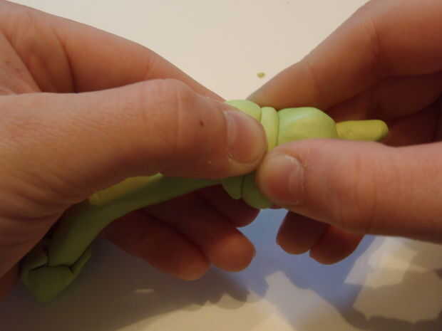 Empuje a la cabeza, lo que es más pequeño y squattier. Sigue pulsando hasta que no haya espacio entre las secciones. Luego, suave sobre las costuras para que ellos desaparezcan.