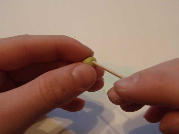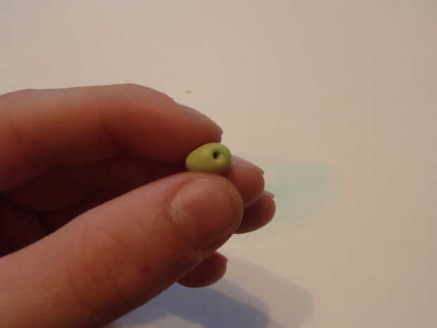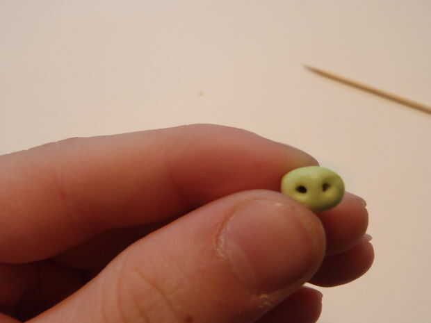 Consigue un trozo muy pequeño de arcilla que es del mismo color que la madre. Rodar en una pequeña forma ovalada y utilizar un palillo para empujar pequeños nariz asegurándose de no meter por el otro lado.