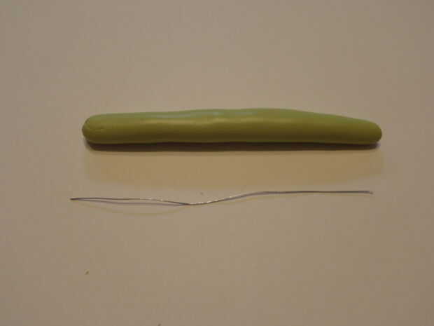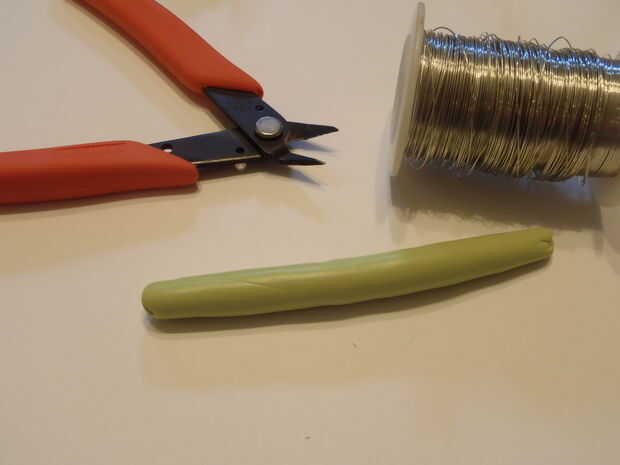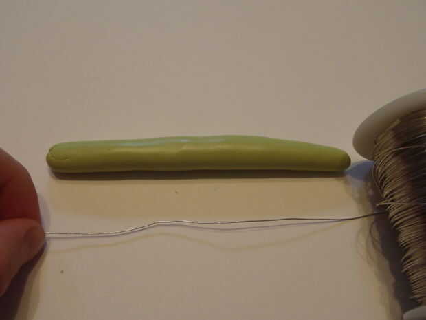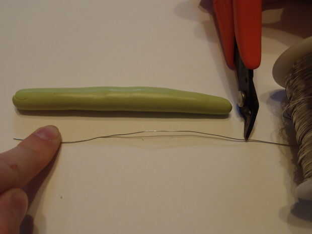 Obtener el alambre y el cortador de alambre. Medir el alambre hacia fuera un poquito más corto que la arcilla y cortar.