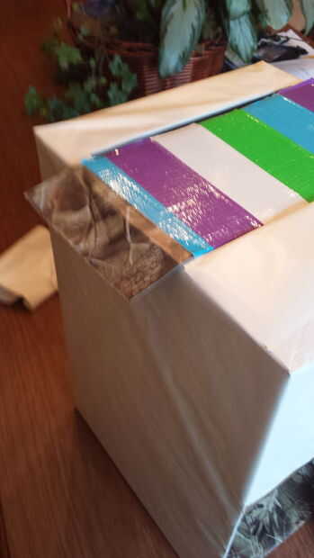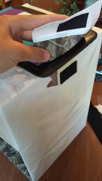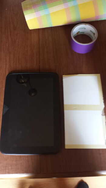 Decidí hacer un soporte para que mi tablet no salga de la caja o moverse cuando ver películas. Usé una amplia tira de cartón de desecho otra vez para fijarlo y usa cinta para envolver el cartón. Después se graba la tira de cartón, coloque la tira sobre el agujero superior y cinta a un lado de la tira. Deja al otro lado de la franja libre colocar velcro en él. Me pareció más fácil descansar mi tablet boca abajo encima de la caja y luego envolver la tira de cinta sobre él. Luego cortar un trozo de velcro y había colocado en la parte inferior de la tira de cinta de conducto. Además, me aseguré de que elimine el papel de embalaje para que el otro trozo de velcro en la caja fijarse a la caja y no el libro... de lo contrario el papel rip al intentar abrir el titular.