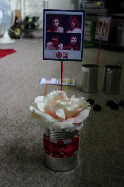 Tenía peso pesado papel fotográfico queda de mis invitaciones de boda que he diseñado, así que sólo necesitaba encontrar algunas imágenes y logos de internet de la banda en primer lugar, para crear las imágenes iniciales para imprimir. Mis colores fueron los del arco iris (tan rojo, amarillo, rosa, verde, morado, naranja y azul) por lo que he asignado a cada grupo un color. Habría 14 mesas en total, por lo que necesitaba 2 de cada color.