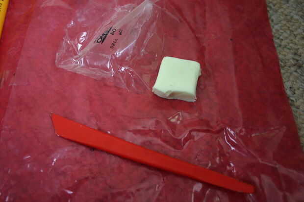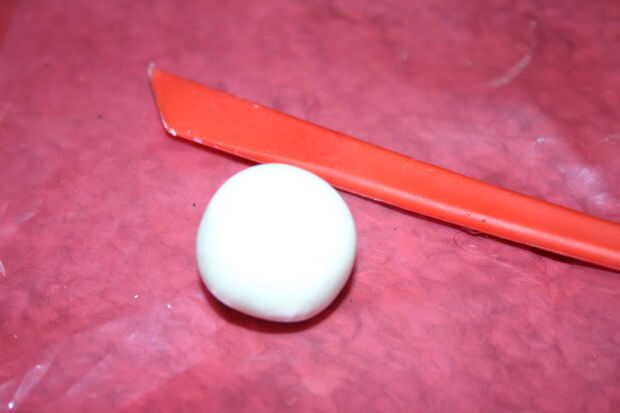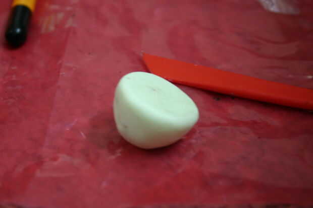 tomé uno de los más pequeños paquetes cuadrados de fimo que tenía y dividido en 4 trozos. Luego rodó cada pieza en bolas y suavemente aplastado de un lado para crear la base de mi portatarjetas del lugar.