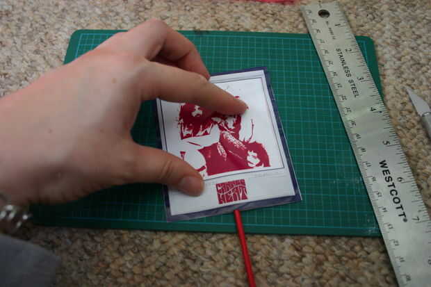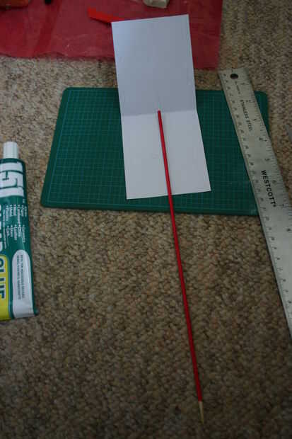 Luego coloca el palo de bambú pintado secado sobre la línea central de la cola y doblado sobre el papel, presionando ligeramente durante 30 segundos para asegurarse de que hace buen contacto con todos los lados.