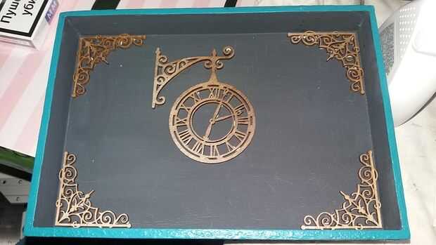 Después de que la pintura seque pegué el reloj decore y los ornamentos en la caja. Lamentando la ventana y los marcos y manchado de la ventana con algunas manchas de base de agua de nogal. Encima de todo he usado mate acrílico transparente.