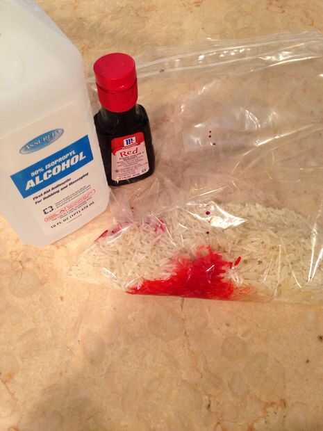 2. Agregue una o dos gotas de colorante para el arroz en la bolsa de plástico. Seguido por dos gotas o menos del desinfectante de alcohol o de la mano.