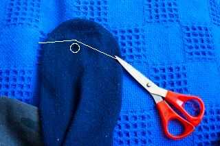 -Corte el extremo del dedo del pie del calcetín, por encima de la costura que has hecho. Ver la imagen de colocación específica; Básicamente, corte plano en el dedo gordo del pie, luego en un ángulo bajo después de la costura