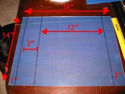 Primero empezamos midiendo nuestro portátil para obtener las dimensiones, el mío es sobre 12 "x 14", eso es lo que me fui con, obviamente tuyo será diferente. El diseño inicial exige un 12 "x 14" con 1" pieza doblada debajo, una sección de canalización vertical de 3", y otro 1" plegada en la sección de la parte posterior. Esta construida de una sola pieza de plexiglás que se derrita en forma con una pistola de aire caliente o soplete. Corté el plexiglás hasta 12 x 18 como por la medición que sólo tomamos, 12" de la base + 3" canalización vertical 1" para el underfold delantero + 1" para el underfold posterior = 18"?? Bien, lo suficientemente cerca, me salva de hacer 2 cortes y eso significa menos oportunidad de romper el plexiglás. (He roto mucho en el pasado.) (Nota: dejar las hojas de protección en el plexi hasta que la calefacción del arma parte para evitar arañarlo para arriba).