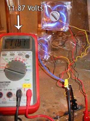 El diagrama de abajo tiene cableado simplificado, realmente nada complicado una vez que la corriente funcionó. Se puede ver que la tensión por el circuito abierto es de 11,87 voltios (nosotros la llamaremos 12V). Pensé en poner un reóstato (control de velocidad) en la línea para ajustar la velocidad del ventilador en caso de que deseé quiter operación, pero los fans son super tranquilos por lo que no veo ningún punto. Después de que todo está probado y funciona correctamente, romper el soldador y el tubería del encogimiento.