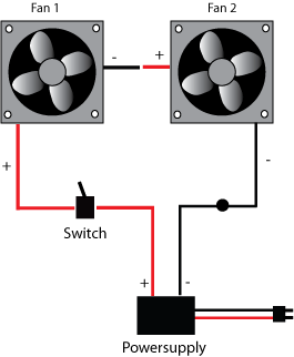 He encontrado una fuente de alimentación 24 voltios 2 amperios de una impresora de recibos Epson que era casi nueva! Ahora el problema se pone interesante, cómo conseguimos 24 voltios hasta 12 voltios de un utilizable para que nuestros fans poco no intentan despegar cuando tapa el interruptor. Vamos a ver, ¿qué tal los cables en serie? Sabes, cableado el positivo del primer ventilador al positivo de la alimentación, negitive del primer ventilador para el positivo del segundo ventilador y luego el negitive del segundo ventilador a la tierra de alimentación led (véase el diagrama). Esto va doble los ohmios (60 X 2) para hacer 120 ohmios ya que añadir de serie crea más resistencia (agregar el valor de los ohmios por ventilador para conseguir el total). Así en tu calculadora ohmios agregar los 120 ohmios a la fuente de alimentación de 24 voltios, calcular el éxito y nos da.2 Amps a 4,8 vatios. Los amplificadores.2 es desean de nuestros fans y el hecho de que estamos conectados en serie hace cada toma 12 voltios de la fuente de alimentación de 24V 24 voltios dividido por 2 (2 ventiladores) = 12 voltios. Por lo que cada fan conseguir sus necesarias 12 voltios y los amperios.2 adecuados, y todo está bien. Si la fuente de alimentación solo 12V y hemos conectado los ventiladores en serie entonces cada ventilador sólo funcionaría en 6 voltios o 1/2 la velocidad que pueden correr. Así que menos voltaje y los fans girar más lento que sería aceptar como los amplificadores estaban dentro de la gama de ventiladores e importaba menos enfriamiento potencial. Más tensión se hace girar más rápido y cualquier quema o quemar.