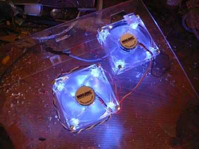 El led amarillo saliendo de los admiradores es para monitorear la velocidad del ventilador cuando conectado a la placa base. No se utiliza en este proyecto. Sólo había torcido alrededor leds negitive (negro) o positivo (rojo) y metidos en la contracción de la tubería para mantener fuera del camino. El cable de alimentación se introduzca en el agujero que perforó y se lleva a cabo en por la Bushing.Slide de alivio de tensión el tubo del encogimiento en un extremo del alambre, tuerza los dos LED, soldadura, deslice a la contracción de la tubería en la Junta soldada y calor con un encendedor o una pistola de calor. Para los conectores del interruptor utiliza utiliza hembra crimp en quck conectar zapatas que apenas resbale sobre las zapatas macho en el interruptor. Ataduras de cables pequeños pueden utilizarse para limpiar todos los cables sueltos y seguro de ser atrapado en los fans.