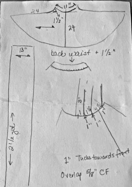 yo alado del patrón, pero he incluido un diagrama dibujé en papel chatarra para ayudar a ilustrar mi intención. La falda es una falda de círculo básico, y las correas son un poco plisadas en la parte delantera. Es muy simple, y sería apostar para decir una talla de una gran cantidad de diferentes tamaños.