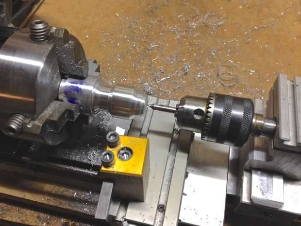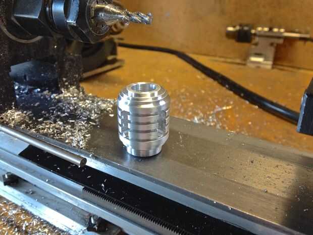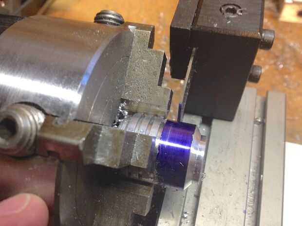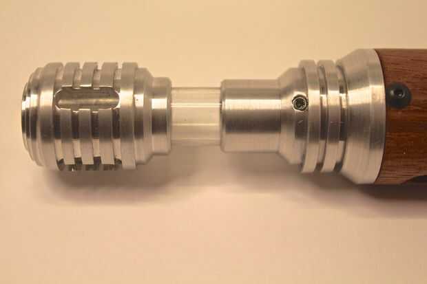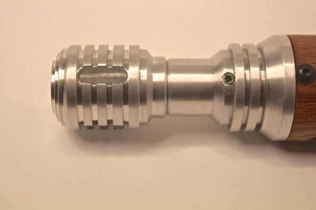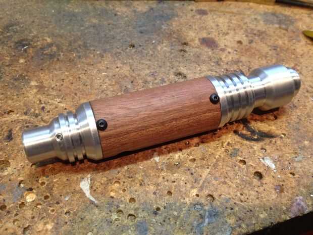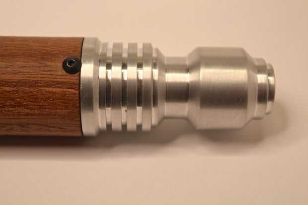 La pieza posterior del cuerpo se convirtió en una manera similar como el pedazo de delantera y fue ahuecada con una barra aburrida. Ambas piezas de cuerpo de aluminio fueron luego perforaron y roscados por lo que podría ser sostenidas en el cuerpo de centro de madera con un par de tornillos de cabeza botón pequeño. Después todas las piezas de prueba montado se les dio un acabado con una almohadilla de scotchbrite. Finalmente el tubo de acrílico fue pegado en la pieza de la nariz con pegamento.