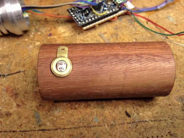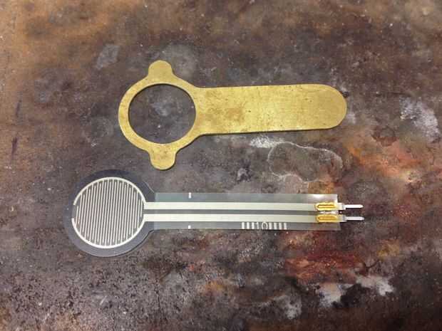 La placa de cubierta para el resistor sensible fuerza fue corte de hoja de latón, recocida con una antorcha y doblada para que coincida con el cuerpo de madera. La resistencia tiene un forro adhesivo, pero pensé que no había manera que correctamente adherirse al cuerpo de madera redondeado para que la placa de cubierta fue ideada como una forma de mantener la resistencia en su lugar dejando el área adecuada cojín redondo expuesta. Los extremos de la fuerza de corte diapositiva resistor sensible por una ranura pequeña en el cuerpo de madera debajo de la cubierta placa-esto facilita la Conecte el resistor a la electrónica dentro del cuerpo de madera.
