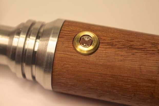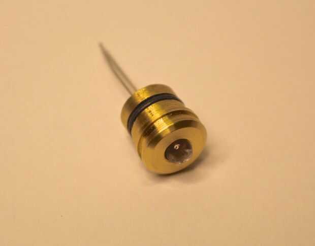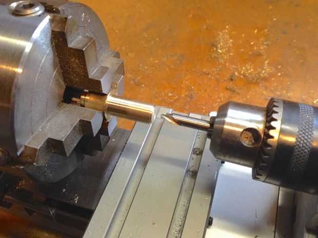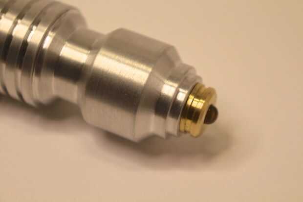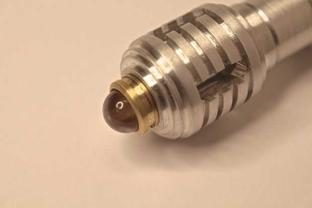 Comencé con el soporte para el 10mm azul LED se encuentra en la pieza de la nariz. Esto fue dada vuelta en el torno y el LED se pega con pegamento. El soporte para el LED blanco en la parte trasera también fue dada vuelta de culata de latón y una ranura de 5mm fue cortado por lo que podría instalarse un anillo así que podría ser quitado-hice esto antes de colocar a un conector de carga en el extremo del destornillador.