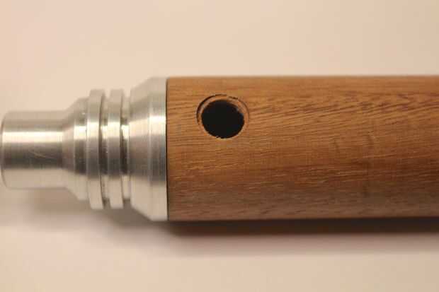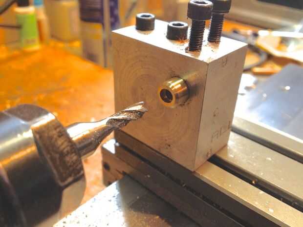 Luego vino el sostenedor de cobre amarillo de la fotocélula. La fotocélula cuenta con una forma plana ovalada por lo que el centro estaba aburrido y entonces una ranura ovalada fue molida en la pieza utilizando un molino de extremo de 3/16". Después de prueba de ajuste de la fotocélula que un alivio de 3/8" de diámetro fue cortado en el cuerpo de madera usando un molino de extremo de 3/8" en mi taladro hasta el soporte fotocélula sentarse a ras en el cuerpo de madera.