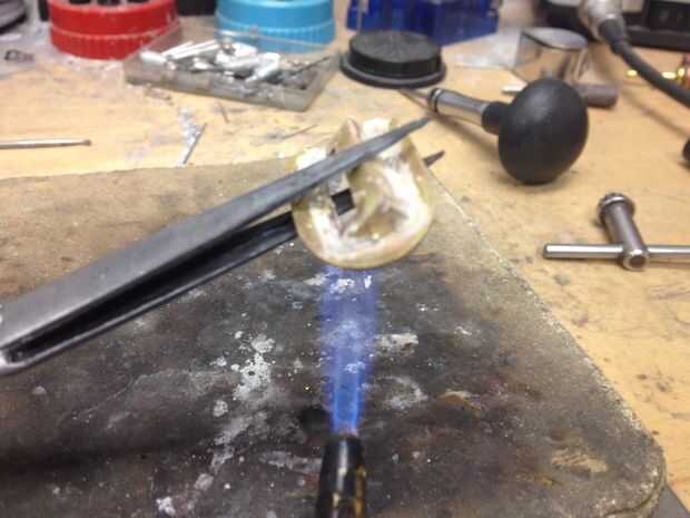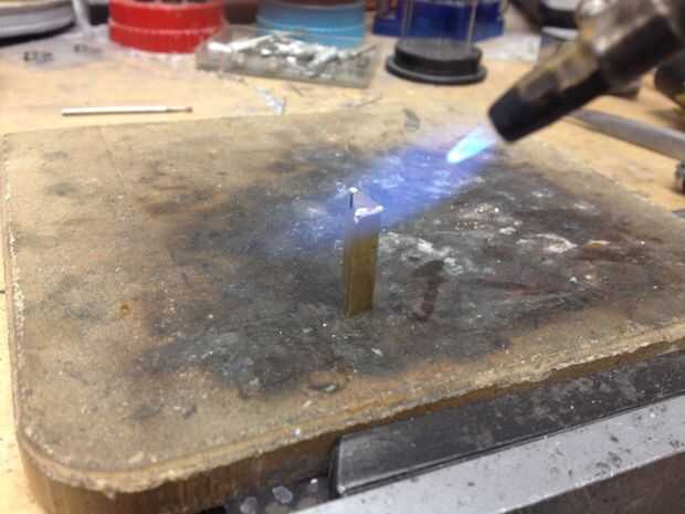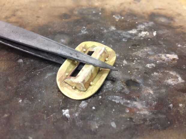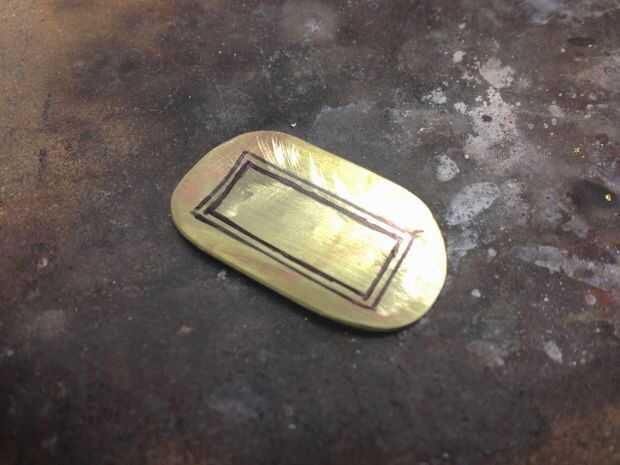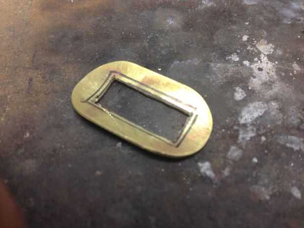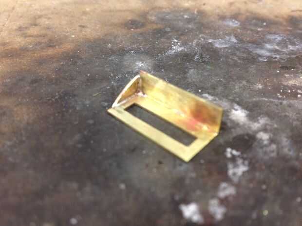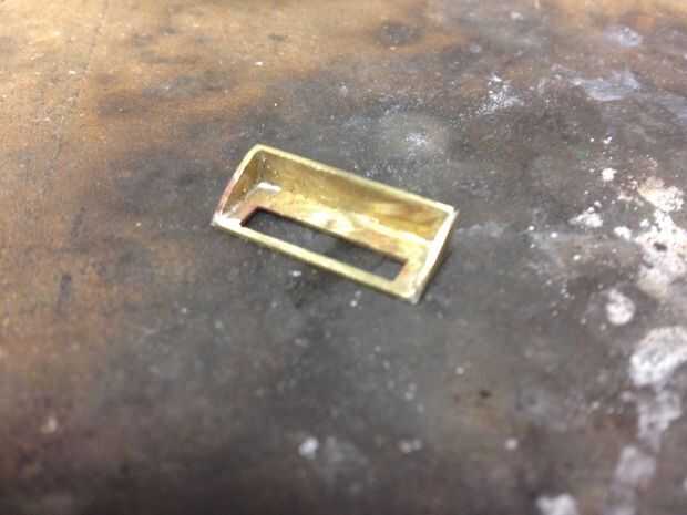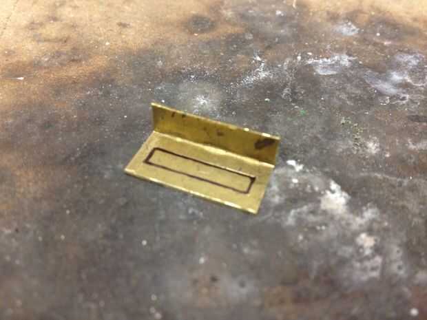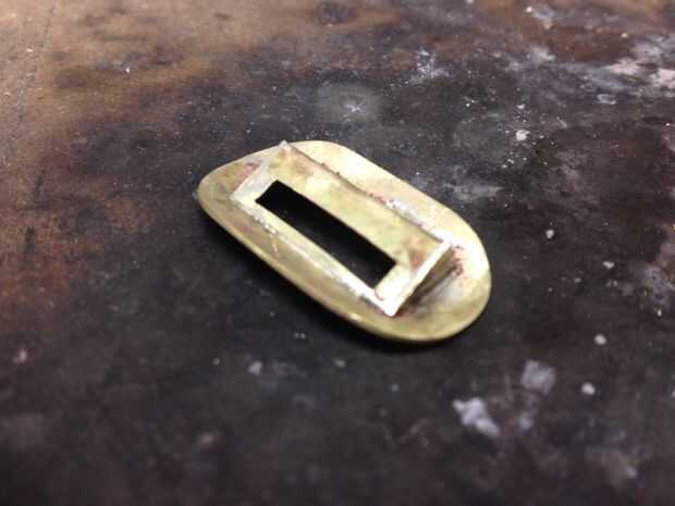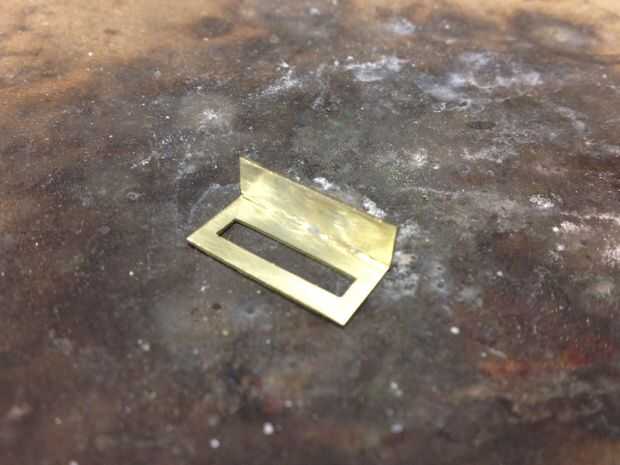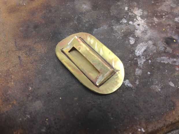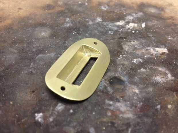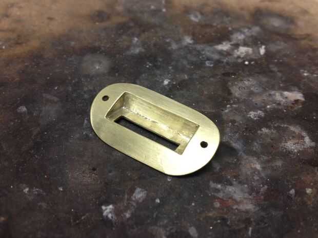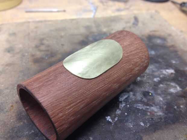 Empecé doblando un pedazo de hoja de latón en ángulo recto y entonces yo cortar una ranura en lo que coinciden la ranura micro SD tarjeta del titular de la por lo que la tarjeta se deslice a través. A continuación dos pequeños pedazos triangulares plata soldada en los extremos de la pieza doblada-el borde externo de estos empareja la curvatura del cuerpo de madera. A continuación recorta y había recocido una placa oval de latón con una antorcha y doblado para coincidir con la curvatura del cuerpo de madera. La pieza angular de latón con la ranura en se coloca en la parte inferior de la placa oval de latón. Luego se dibujan líneas alrededor de la pieza angular para determinar cuán grande para cortar la abertura para que pueda soldar en. Una vez que la pieza angular fue soldada en su lugar con una antorcha de los bordes se recortan/presentaron ras y fue dado un acabado cepillado.