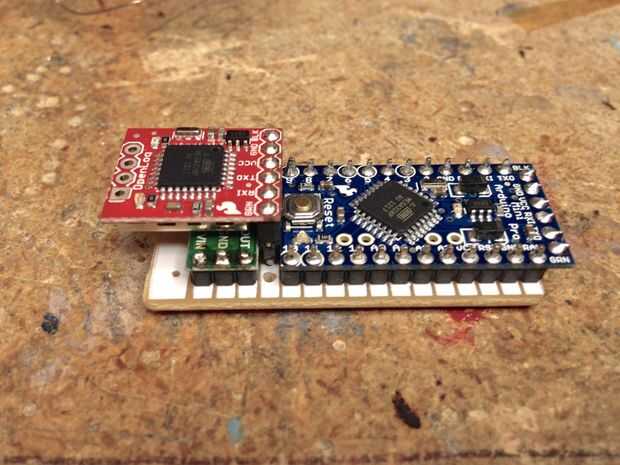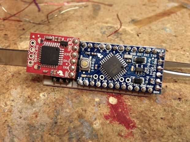 Una vez que el Mini Pro fue soldado en el lugar que estén soldada en un encabezado para el OpenLog. El OpenLog debe ser extraíble como el mismo pasadores que se utilizan para programar el Arduino son los pines usados para enviar datos a la OpenLog. En la parte inferior de la Junta conectar estos pines con alambre magneto de calibre fino para ahorrar tanto espacio como sea posible. Para proteger los hilos finos de la abrasión (y posiblemente causando un cortocircuito) puse primero una pequeña franja de cinta Kapton antes de soldar los cables en su lugar. Una vez que los cables se sueldan pongo otra capa de Kapton cinta sobre los cables. Cinta de Kapton es estancias awesome stuff-it poner muy bien y el calor de la soldadura de hierro no dañarlo. También se puede utilizar para sujetar los cables en su lugar mientras se suelda, que es bastante útil.