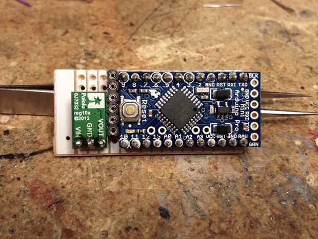 Comencé por el Arduino en lugar de soldadura en primer lugar, seguido por el paso por el regulador de voltaje. El Arduino Mini Pro he utilizado es la versión 5V pero el 3.3V versión puede utilizarse también-usted sólo tiene que cambiar dos pequeños detalles en el código (mencionado en el código) y cambiar cómo funciona el poder del paso convertidor. En 5V versión que eléctrica el paso convertidor está conectado a Vcc pero en los 3, 3V Mini Pro tiene que estar conectado al pin Raw. Es la única diferencia, por lo que es bastante fácil de adaptar a cualquier versión quiere uso uso cualquier versión mejor compatible con los requisitos de tensión de los sensores que desea utilizar.