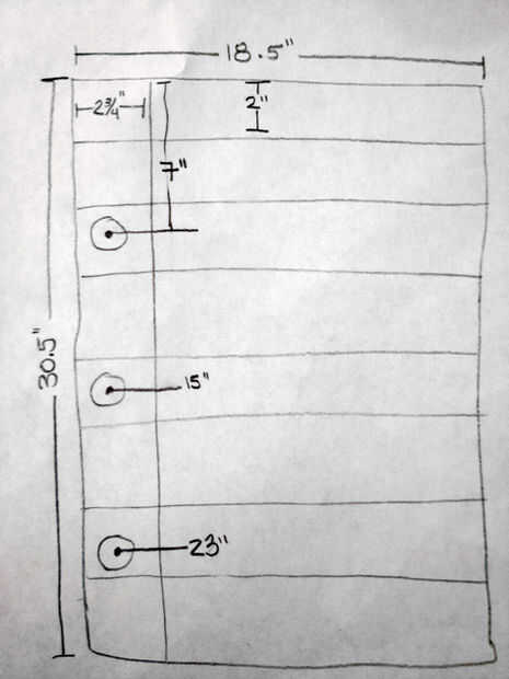 • Los círculos son 1 1/4" de diametro, centro del primer círculo es 7" desde la parte superior, segundo círculo es 15" desde la parte superior, tercer círculo es 23" de la parte superior