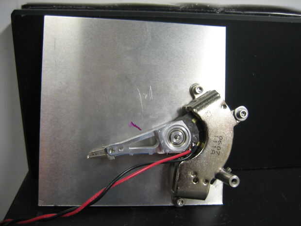 Ajustaron dos pequeños imanes que rescatado de otros discos duros a dos postes de metal. Hay una "bandera" en la cabeza de lectura que es magnética y cuando está en la posición derecha o izquierda en esta imagen, la cabeza de lectura obtiene en lugar por los imanes. Esto es bueno ya que será la cabeza de lectura en posición vertical y no quiero caer en otra posición debido a la gravedad.