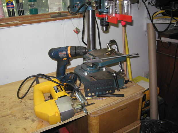 Caseras trabajo bricolaje Dremel Ozito Black & Decker Mini prensa taladro muy barata y fácilImpulsado mediante un motor viejo mano herramientas eléctrico rotatorio, este taladro casero,construido en su mayoría de viejas piezas de auto y algunos artíc