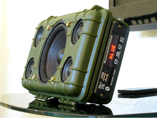 Realmente no tuve ningún diseño al hacer este proyecto, tuve una especie de "ir con la corriente" de vibe. Un día fui al centro comercial para comprar mis útiles generalmente luego de repente me encontré con este caso Pelican-como genérico. Vendían para P480 como ($9,60), todavía tenía algunos altavoces ahí, así que pensé que sería cool para mi cuatro altavoces fullrange no utilizada + mi woofer de 4" de alta fidelidad. Sin dudas, compré el caso aspecto impresionante. Como volví a casa, empecé a buscar las piezas en el inventario. Todavía tenía algunas fichas amp ahí. Encontré dos módulos de amplificador de 2 x 3 extra (forma dx.com) y mi querido jugador el módulo Bluetooth (de dx.com).