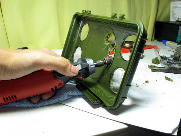 Aquí está mi secreto! Muchos están teniendo dificultades para hacer los agujeros perfectamente redondos altavoz con una herramienta giratoria. Si has escuchado alguna vez de la "broca de tambor de lija", ahora es el momento perfecto para comprar uno. Inicio de perforando un agujero grande dentro de su marcas circulares y arena del plástico sobrante hacia sus marcas. La Leatherman es lo suficientemente fuerte cortar el plástico, se puede utilizar para el agujero del interruptor.