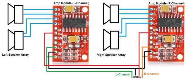Montar el módulo de amplificador PAM8403 en arreglo de discos de altavoz izquierda y derecha. Se refieren a la imagen de arriba para las instrucciones de cableado.