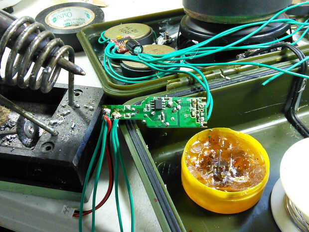4.) paralelo de ambos PAM8403 amp módulo entrada 5v a la salida de 5v del cargador 12v USB de la soldadura.