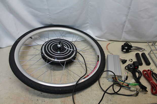 Como ya he mencionado, tengo el kit de conversión de thediyoutlet.com. Tienen una variedad de kits, pero fui con uno para la rueda delantera de su bicicleta. Originalmente quería ir con la versión de la rueda trasera con el sistema de ayuda del pedal, pero estoy pensando que para futuro hacking y modificación del kit básico, la versión de la rueda delantera será más fácil migrar a otra plataforma. Fui con el sistema de 48 voltios, 1000 vatios, como soy un chico bastante grande y no quería que el sistema de 36 voltios instalado sólo para descubrir que no tenía suficiente retroceso para tirar todos 300 libras de depotdevoid alrededor de la ciudad.