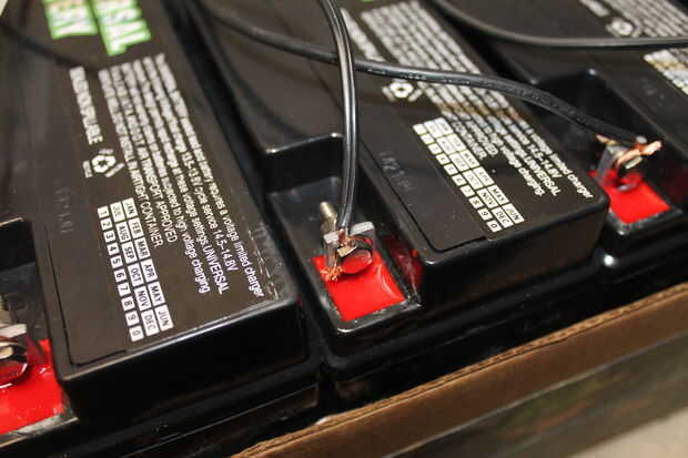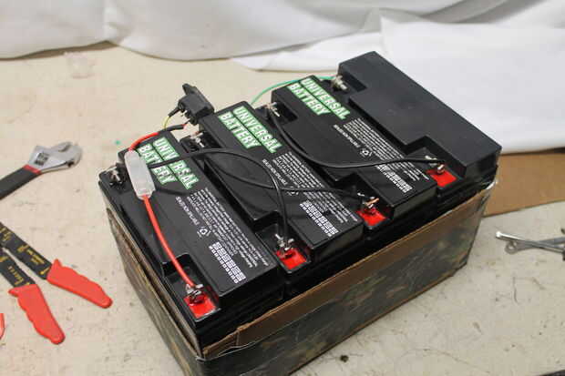 Con un cable de calibre pesado (yo usé el alambre de un cable de alimentación de ordenador viejo), alambre de las baterías en serie, positiva de una batería al negativo del siguiente. Conecte el conector incluido el positivo de la primera batería y la negativa de los últimos (ver fotos).