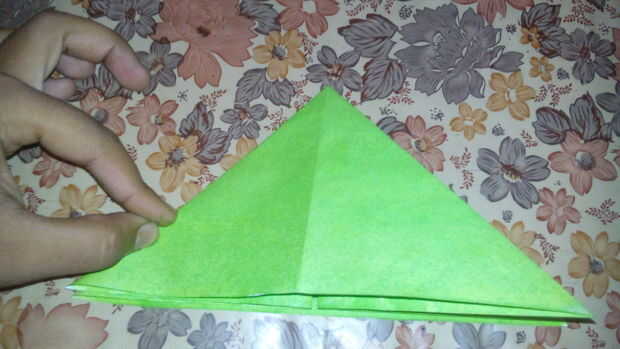 pellizque los lados- Centro el papel sobre la mesa para que el borde inferior quede frente a usted. Empuje en los lados a lo largo de los pliegues, de modo que la plaza se derrumba en forma de triángulo con dos lados.