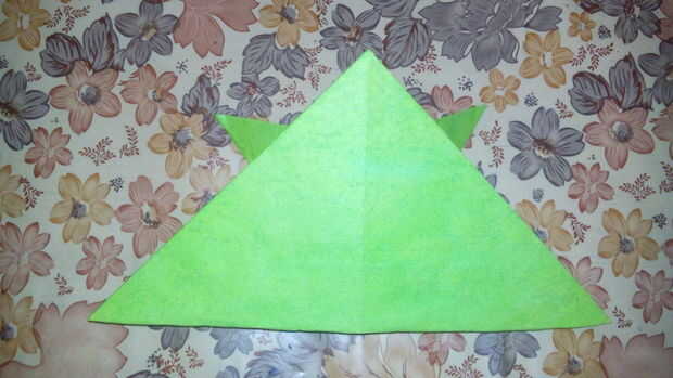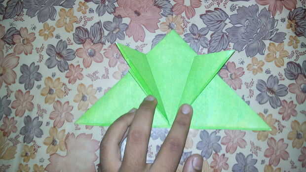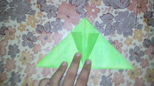 Crear las patas de-la rana Sostener el papel para que la base del triángulo quede frente a usted. El punto del triángulo, bajo la capa de diamante, se divide en dos partes. Doblar una hacia fuera, hacia el lado derecho del triángulo, de modo que su borde se alinee con el borde derecho del diamante. Lo pliegue. Doblar al izquierda hacia fuera, hacia el lado izquierdo del triángulo, para que su borde se alinee con el borde izquierdo del diamante. Lo pliegue.