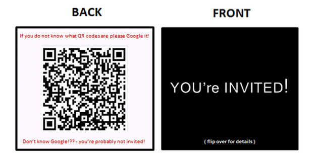 Pero puesto que la mayoría de ellos requiere una gran cantidad de programación fondo decidí seguir con la invitación impresa pero poner una torcedura en él mediante la codificación de los detalles de la invitación de los códigos QR.