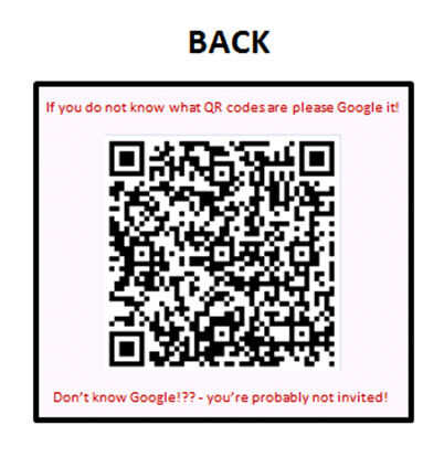 Diseño de la imagen del código QR en la parte posterior de la tarjeta. Puede utilizar cualquier edición software o incluso a Microsoft Word o Paint, se que no eres que techy. Añadir algunos detalles para darle vida a la invitación, no te equivocarás con humor. Simplemente no hacerlo políticamente o religiosamente ofensivo – LOL!