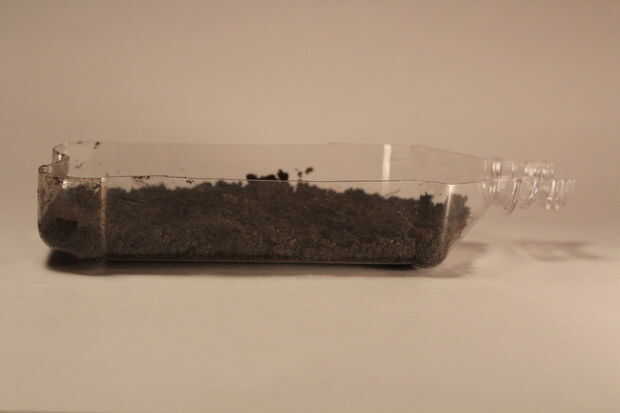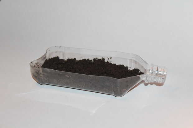 Llene el fondo de la mitad de la botella con buena tierra de siembra, puede poner algunos nutrientes agregados en él si quieres.