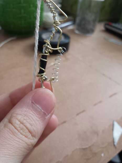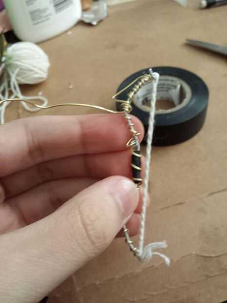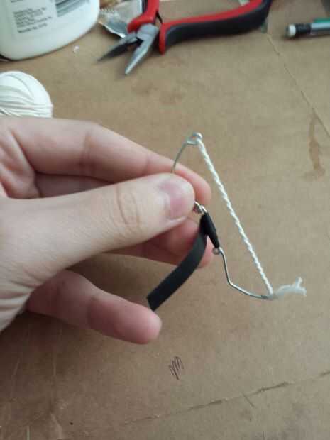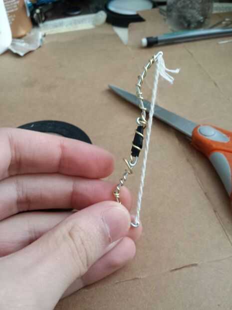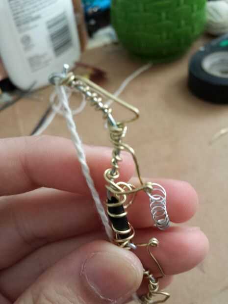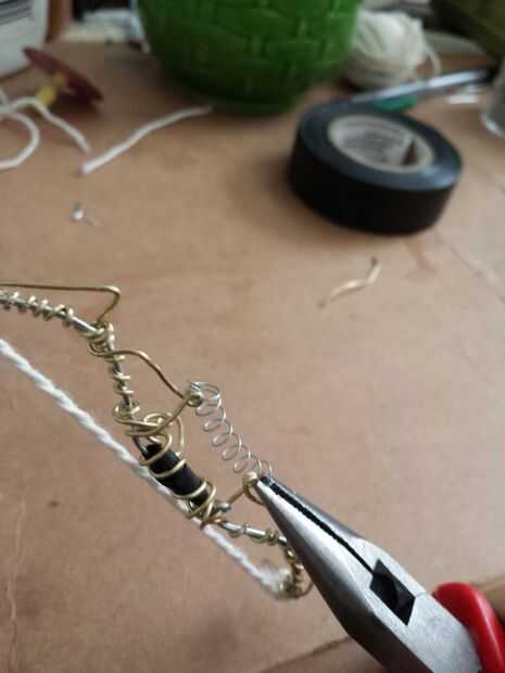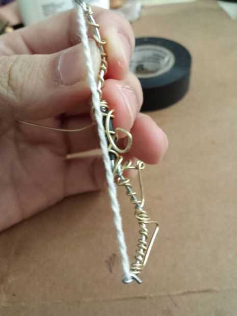 Comenzar con la empuñadura cortando una delgada franja de cinta aislante y envolver alrededor de la mitad para obtener un agarre. Utilice el cable de color y alicates para empezar a envolver el arco de alambre que servirá el arco conservar forma (esto va tomar un tiempo) Consulte aquí para ayuda. Usando un pice segundo de alambre envuelva y crear la forma que se ve en las fotos anteriores. luego añadir el resorte de la pluma a través de los lazos hechos con el fin de aumentar la fuerza. IMPORTANTE: después de ambos lados del resorte del pen en cortar las partes extras y hacer seguro para utilizar los alicates para doblar los extremos para que usted no consigue apuñaló mientras filmaba.